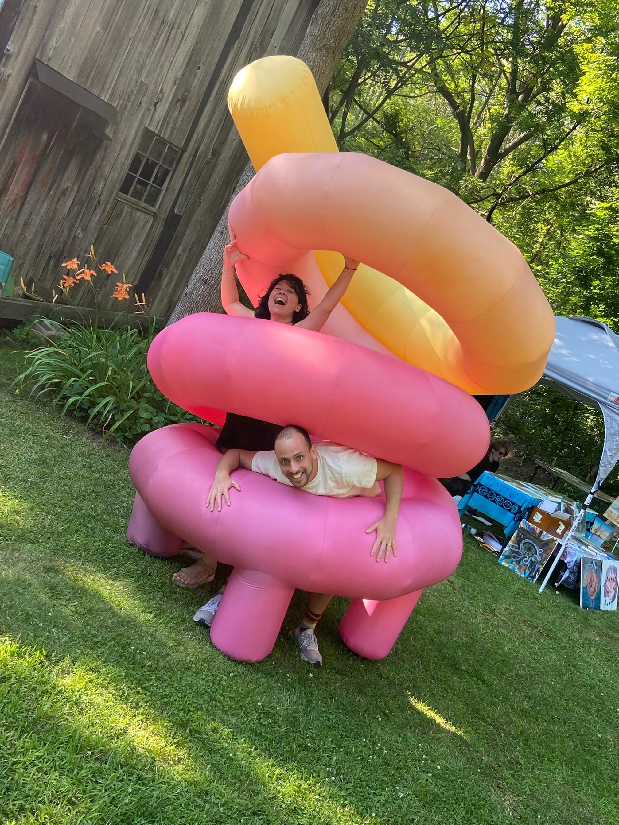 Karyn is a fiber artist that believes we are like pompoms— many pieces connected by a common thread. She learned about inflatable-making in art school and fell in love with the guerrilla nature of inflatable art and the ability to make large scale sculptures easily transportable. Whether it be inflatables, pompoms, or community craft nights, the heart of Karyn’s work is to bring people together and connect through play.